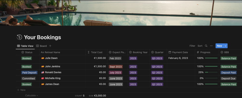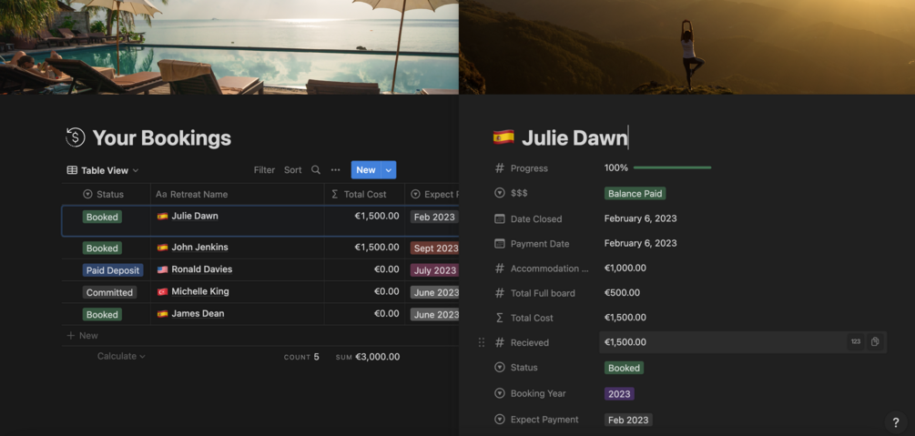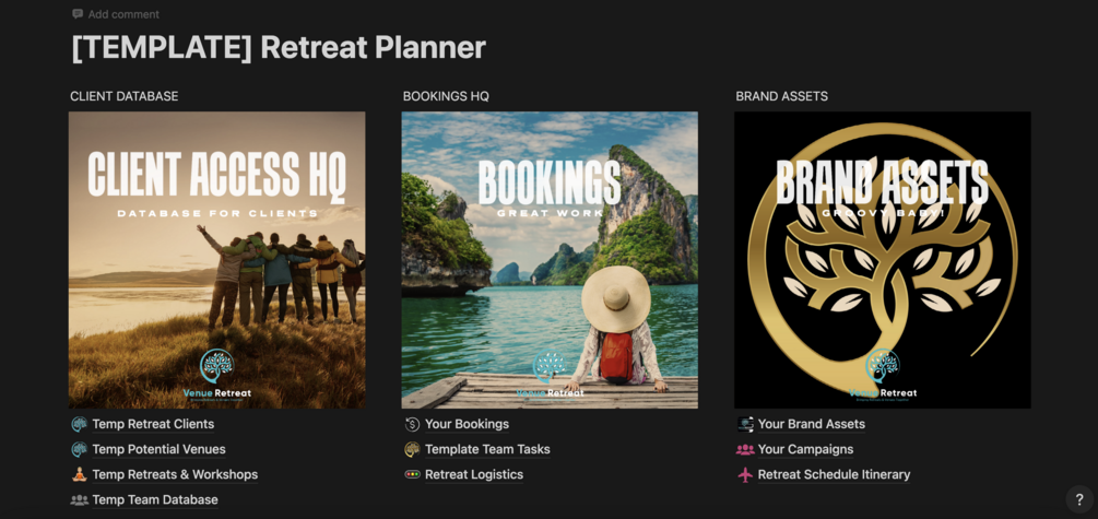 This Notion Template is ideal for those who own or run a business who would like to keep track of clients signing up to their retreats or events, booking venues and needing a space to plan logistics of travel for their groups.