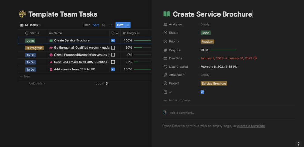 A Notion Template with several databases related together such as Clients, Potential Venues, Tasks & Workshops.